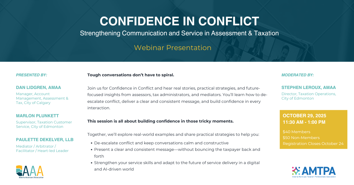 Join the Alberta Assessors’ Association and AMTPA for this interactive webinar designed to help assessors and tax administrators build confidence in conflict and strengthen service delivery skills.